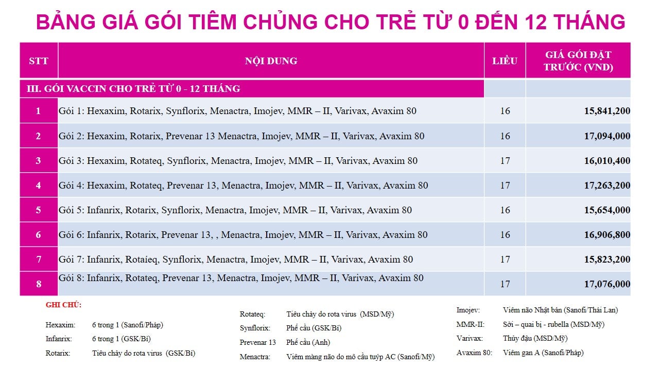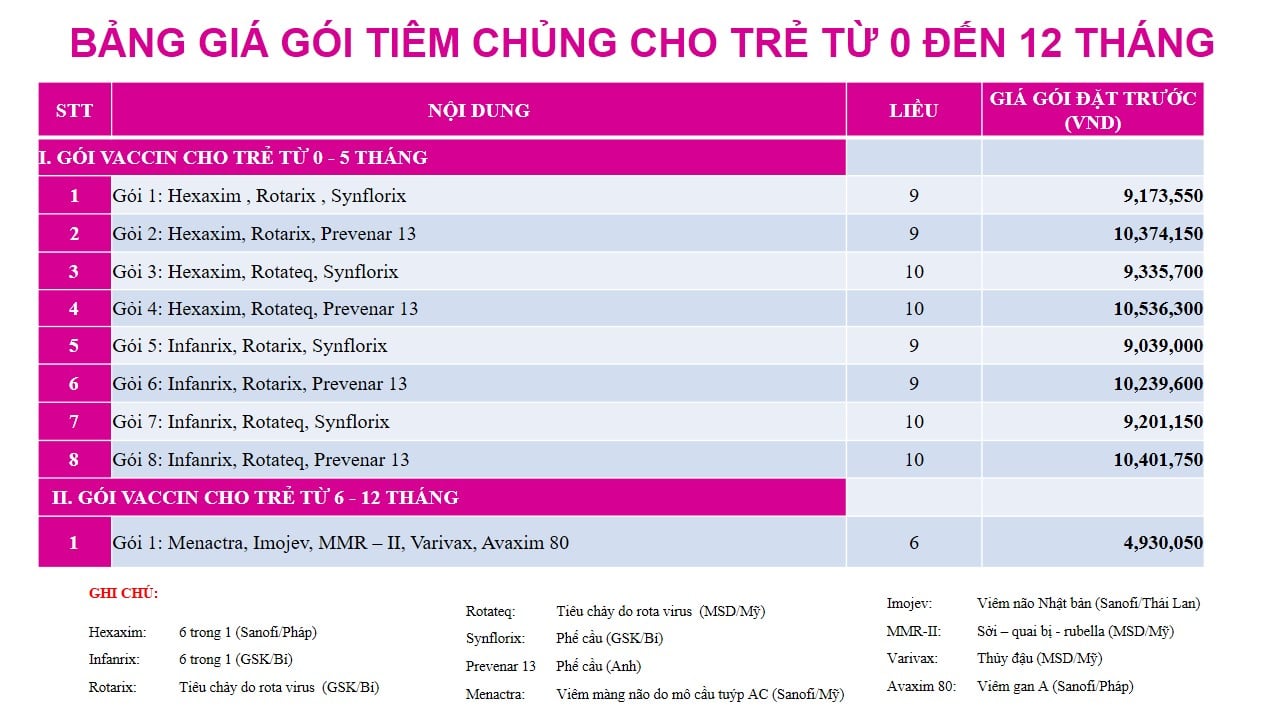 Bảng giá gói tiêm chủng cho trẻ từ 0 đến 12 tháng