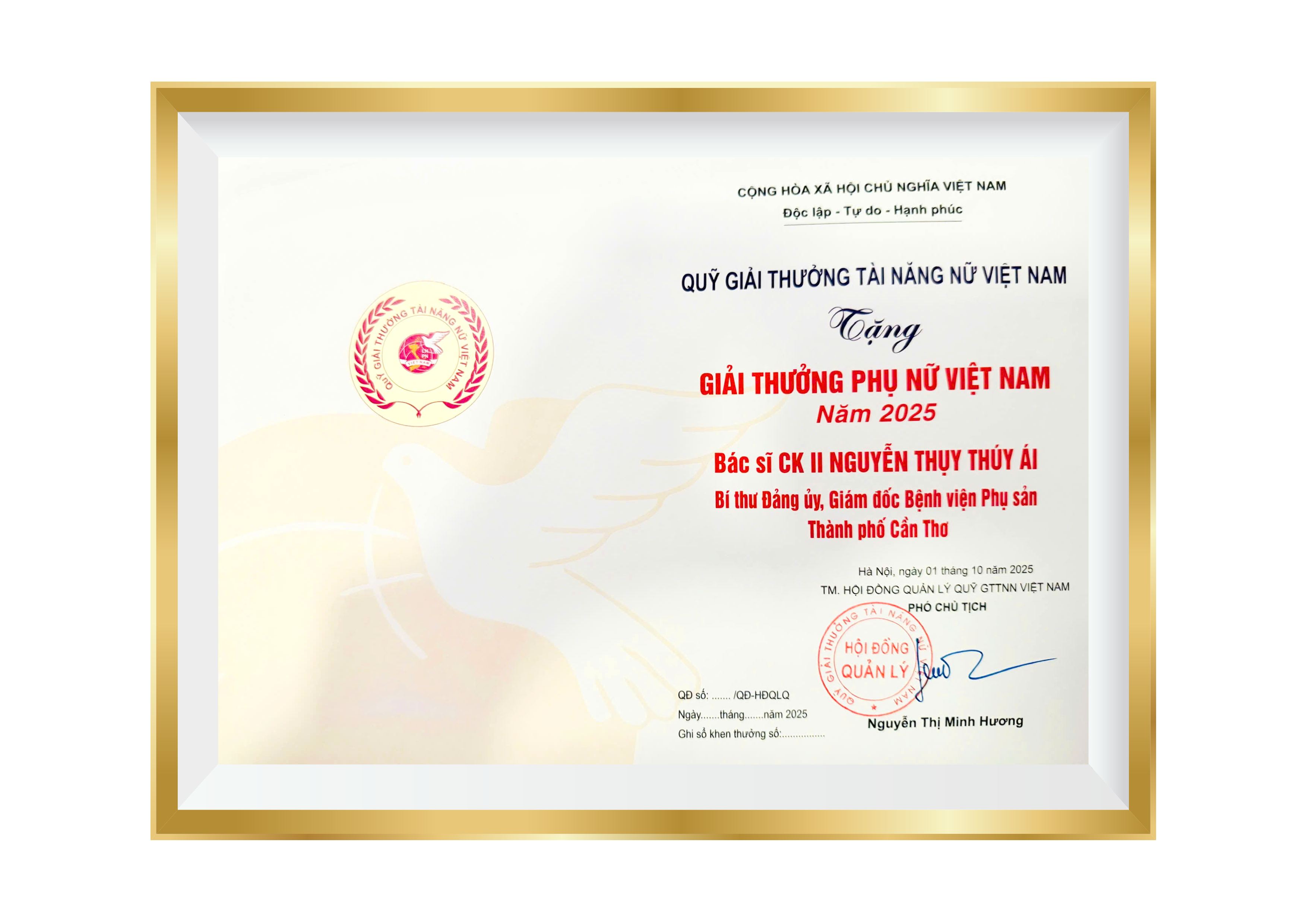 NỮ GIÁM ĐỐC BỆNH VIỆN PHỤ SẢN TP. CẦN THƠ ĐƯỢC VINH DANH GIẢI THƯỞNG PHỤ NỮ VIỆT NAM 2025