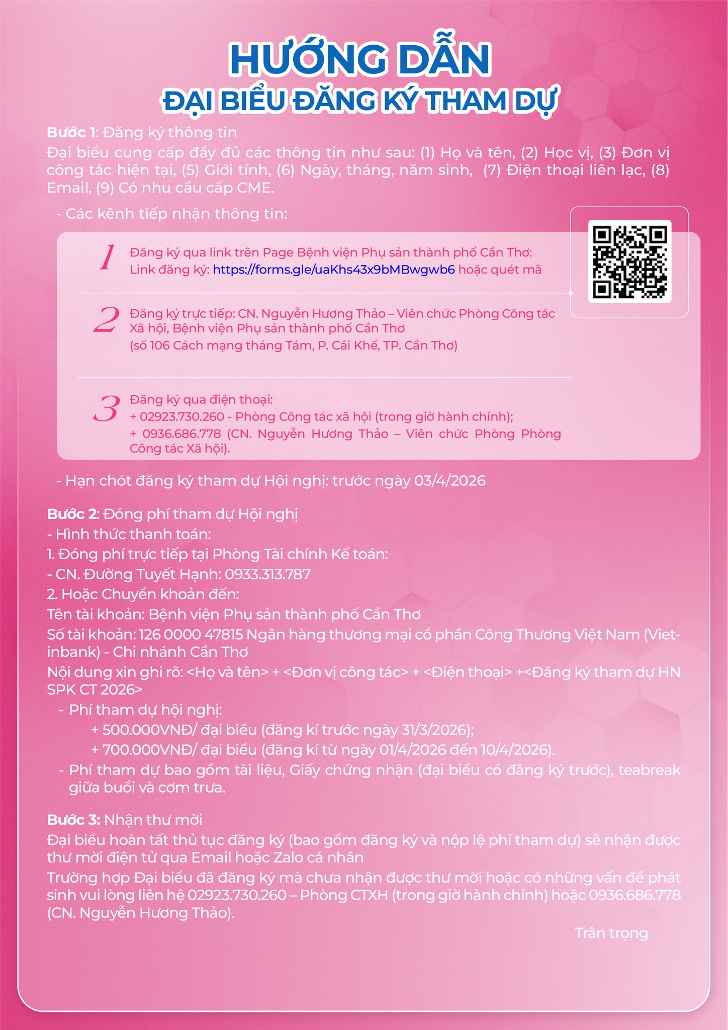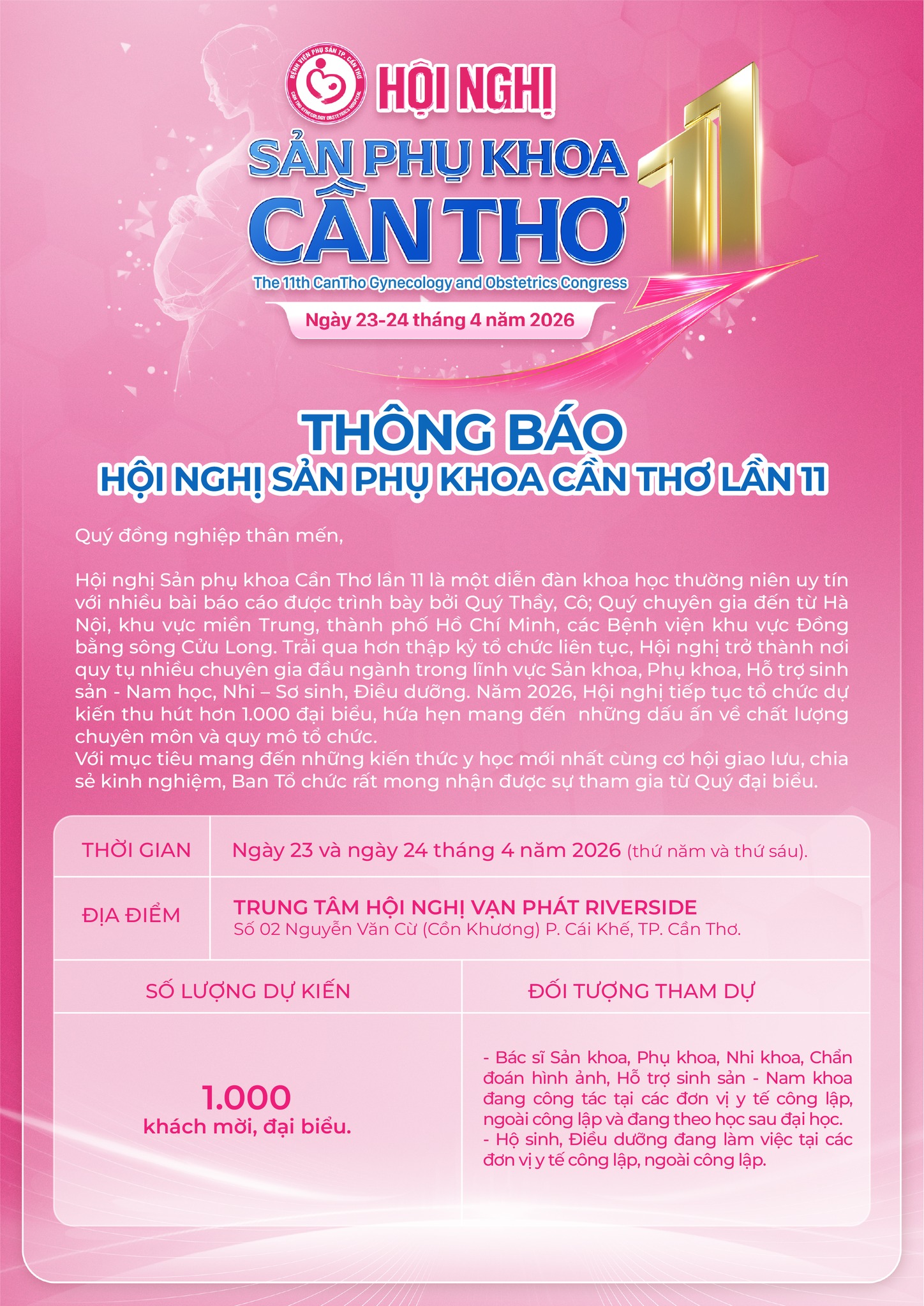 Bệnh viện Phụ sản thành phố Cần Thơ xin kính gửi Quý đồng nghiệp thông tin về Hội nghị Sản phụ khoa Cần Thơ lần thứ 11. Hội nghị thường niên hứa hẹn mang đến những dấu ấn về chất lượng chuyên môn và quy mô tổ chức.