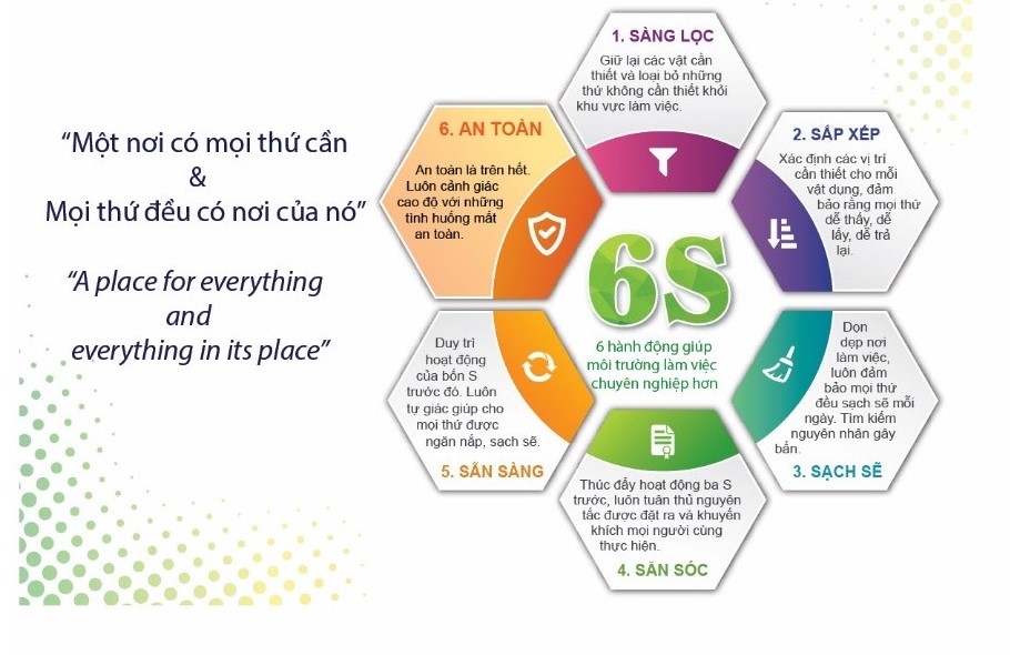Bệnh viện Phụ sản thành phố Cần Thơ đã triển khai 6S toàn viện, trong đó, mỗi khoa/ phòng có đề án cải tiến chất lượng áp dụng công cụ 5S riêng của khoa/ phòng. Hàng năm, Bệnh viện Phụ sản thành phố Cần Thơ tổ chức lớp tập huấn “Công cụ Cải tiến chất lượng 5S và các tiêu chuẩn An toàn (Safety) cho VV-NLĐ” nhằm nâng cao chuyên môn, tránh nhầm lẫn, giảm thời gian tìm kiếm và lấy tài liệu, thiết bị, vật tư y tế. Giúp hạn chế, ngăn ngừa những sai sót, sự cố trong quá trình chăm sóc điều trị, tăng sự tin tưởng của khách hàng đối với dịch vụ chăm sóc y tế tại bệnh viện.