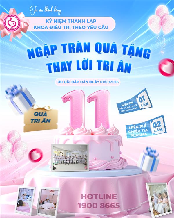 11 năm tận tâm đồng hành – Tri ân trọn vẹn niềm tin! Khoa Điều trị theo yêu cầu, Bệnh viện Phụ sản TP. Cần Thơ dành tặng ưu đãi cực lớn duy nhất ngày đầu năm mới thay lời cảm ơn chân thành đến quý khách hàng.